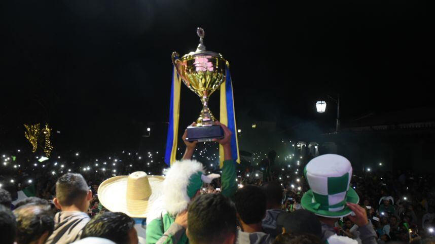 Finalmente llegó la caravana de jugadores, acompañada de miles de aficionados aguacateros, al parque central, donde estaba instalada una tarima y otra gran porción de público aguardaba con luces a sus guerreros.