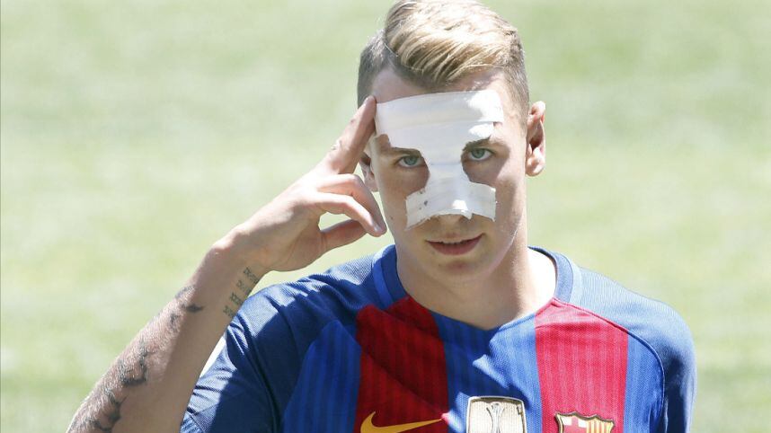 Digne asistió a su presentación con un gran vendaje en el rostro y explicó a Barça TV, que sufrió dos fracturas, una el año pasado y otra esta temporada, por lo que necesitó pasar por el quirófano.