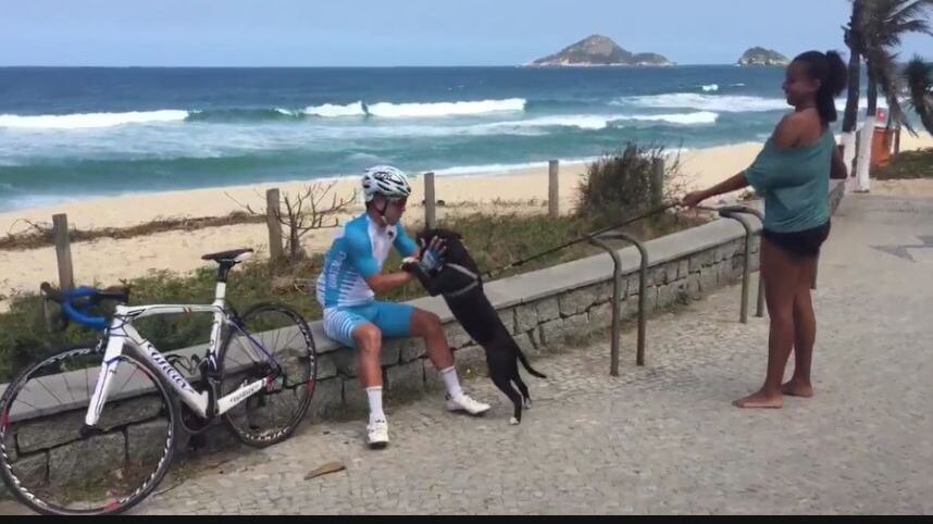 “Manuelito”, uno de los máximos exponentes del ciclismo nacional se tomó un respiro en su rutina de entrenamiento y mientras disfrutaba del inigualable paisaje, un perro se acercó a saludarlo de una forma muy amigable, como cuando reconocen el cariño que eres capaz de dar.