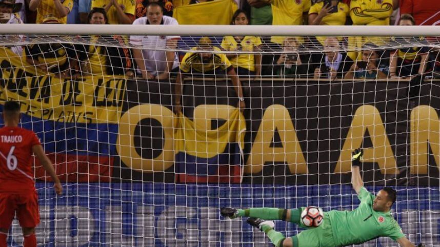 El guardameta colombiano David Ospina atajó el cobro de Miguel Trauco y Christian Cueva lo lanzó por encima del arco.