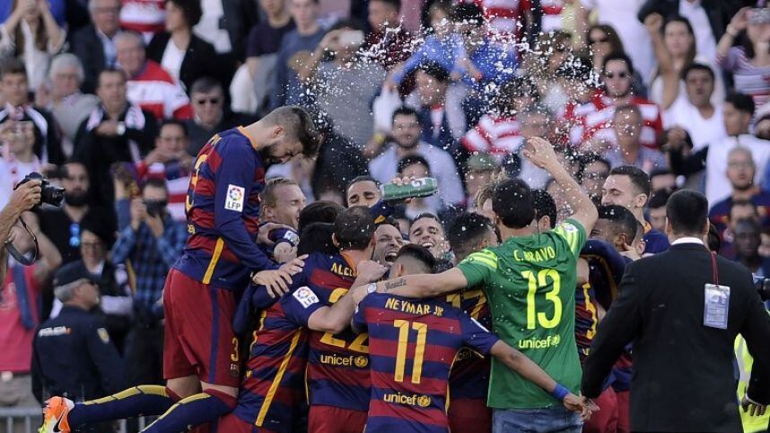 Un triplete de Luis Suárez le permitió al Barcelona vencer este sábado en campo del Granada (3-0), en la 38ª y última jornada de la liga española, con lo que el club catalán logró su 24º título, haciendo inútil el triunfo del Real Madrid en terreno del Deportivo La Coruña (2-0), con dos goles de Cristiano Ronaldo.