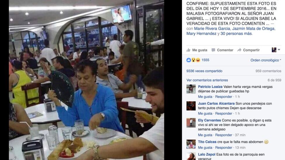 “Es mentira que Juan Gabriel ha muerto. Lo captaron en Malasia desayunando. Es 1 de septiembre. Otra vez al pueblo lo hacen creer y es mentira está vivo“.
