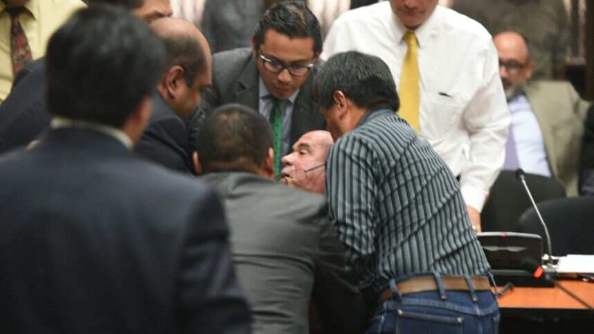 Tras discutir con el juez Miguel Ángel Gálvez, indicó que se “sentía mal de salud” y reunió sus cosas y dejó la sala. De pronto, al salir, se tropezó y aparentemente sufrió un desmayo.