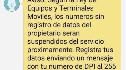 Recientemente, usuarios de telefonía móvil reportaron haber recibido inusuales mensajes de texto que indicaban que aquellos números sin registro serían suspendidos, y que para evitarlo debían debía enviar su número de DPI al número 255.