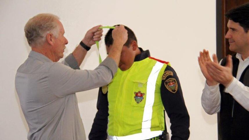 El alcalde capitalino, Alvaro Arzú, ha compartido fotografías en su cuenta de Facebook en la que se le aprecia al condecorar a un agente de la Policía Municipal de Tránsito (PMT).