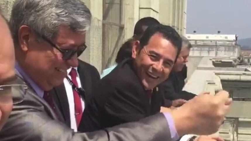 El vicepresidente, Jafeth Cabrera, estuvo junto al mandatario, Jimmy Morales en el palco del Palacio Nacional de la Cultura para ver el paso del desfile bufo de la Huelga de Todos los Dolores de la Universidad de San Carlos de Guatemala, pero no se resistió a hacer una “mala seña” para responder a las consignas que le gritaban.