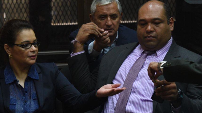 Ya dentro de la sala de audiencia, los sindicados, incluyendo al expresdiente Otto Pérez y su vicepresidenta Roxana Baldetti, se relajan previo al ingreso del juez de Mayor Riesgo B, Miguel Ángel Gálvez, y aprovecha para conversar, tomar café y para compartir un caramelo.