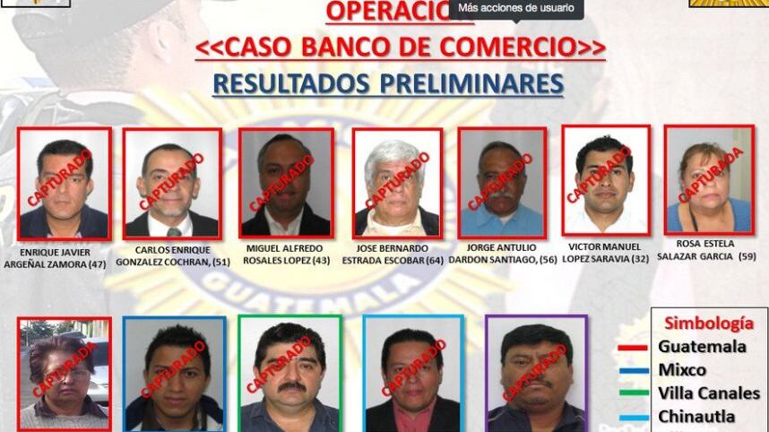 En más de 10 allanamientos en varios municipios de Guatemala y Sacatepéquez, la Policía Nacional Civil (PNC) ha detenido hasta el momento a 12 personas acusadas de lavado de dinero en el Banco de Comercio.