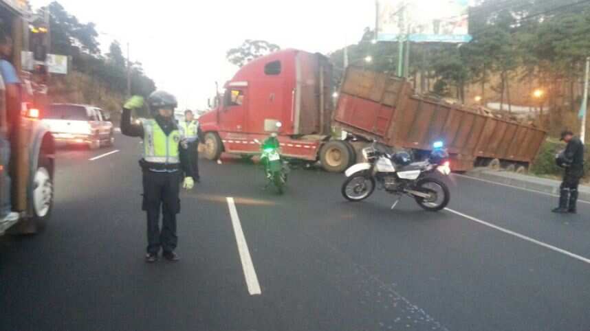 La Policía Municipal de Tránsito del municipio de Villa Nueva alerta a los conductores a tener precaución y tomar vías alternas para las personas que se dirigen al Pacífico, ya que el tráiler interrumpe el paso en dos carriles.