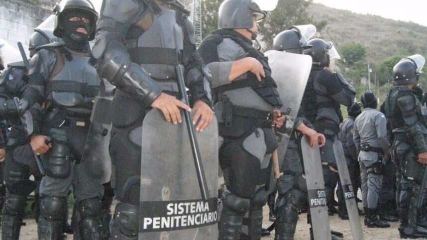 En busca objetos de tenencia ilícita y de retomar el orden, miembros de las Fuerzas Especiales de la Policía Nacional Civil (PNC) y del Grupo Élite de Requisas y Traslados del Sistema Penitenciario realizan una requisa en el sector 11 del Centro de Detención Preventiva para Hombres de la zona 18.
