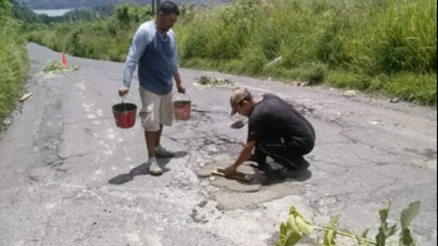 Los vecinos tomaron cubetas, mezcla de cemento y por sus propios medios hicieron el “bacheo” de las grandes grietas que surgieron en esa carretera, probablemente debido a las inclementes lluvias de los últimos días.