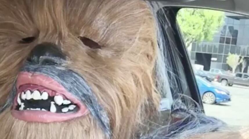 ¡Ahora intercambiaron personajes! Chewbacca se encuentra en el carro hablando cuando se coloca una máscara con el rostro de la mamá.