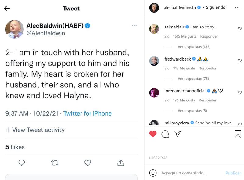 Por su parte, él reveló en sus redes sociales que está cooperando con la investigación y brindando su apoyo a la familia de Halyna.