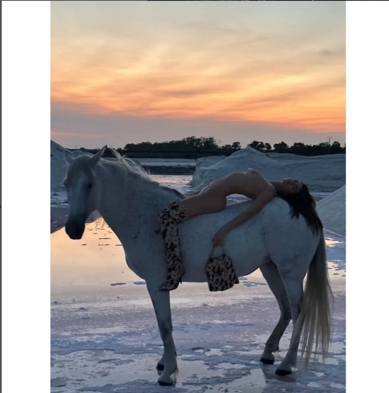 La modelo volvió a revolucionar Instagram con una imagen al borde de la censura posando completamente desnuda y recostada en un hermoso caballo blanco.