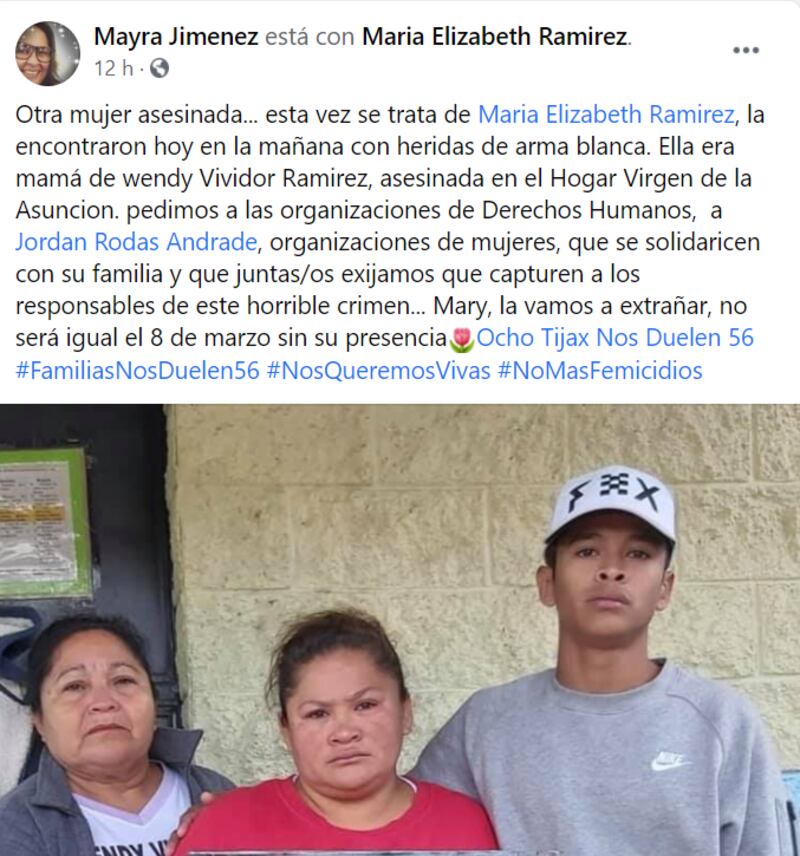 Medios locales en Esquipulas dieron a conocer el asesinato de María Elizabeth Ramírez, madre de Wendy Anaí Vividor Ramírez, una de las 41 niñas que murió en el incendio del Hogar Seguro en marzo de 2017.