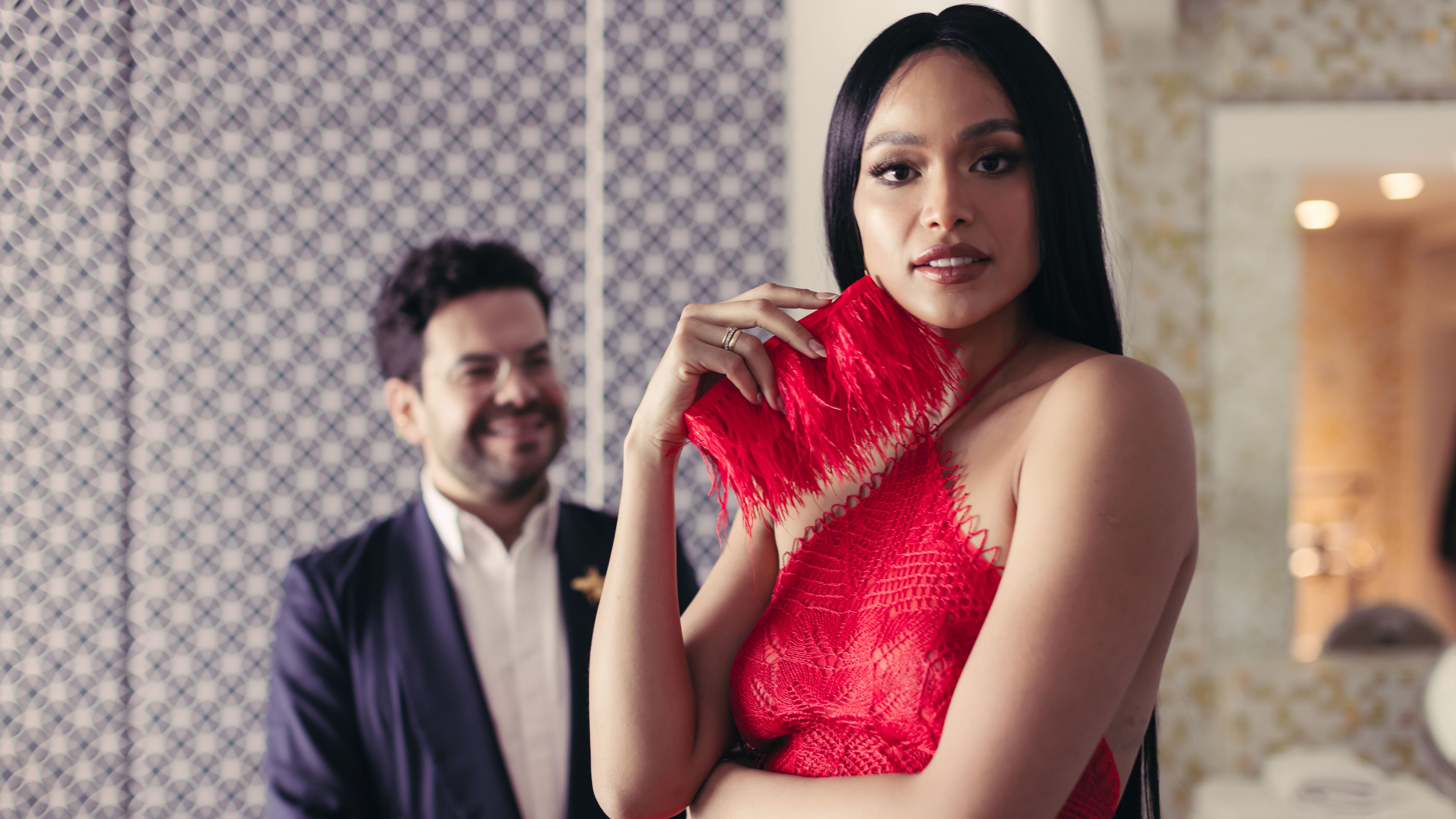 Me hicieron parte de esta campaña de expectativa que ellos hacen todos los años para lo más importante, que era la alfombra roja y para mí es un honor hacerlo. Lo que hice en esta ocasión fue traer una técnica tradicional que ya se está perdiendo en Colombia, que es de Duitama, que son las carpetas de las mamás, para decorar en la casa. Y lo había hecho con un vestido de novia y en un desfile allí. Y lo que hice esta vez fue introducir color en esta comunidad. Así, la señora Elsa Consuelo, no tejió en blanco ni en crudo, sino en rojo y asemejamos un encaje con la técnica de cinco agujas. Esta artesana ha participado en otros proyectos conmigo y con su saber creamos este vestido rojo, llamativo y transparente, lo bordamos en un tul de seda y logramos hacer esta pieza. También recreamos el look de Naomi Campbell con la ex miss Colombia, Andrea Tovar, para recrear esta magia previa a la alfombra roja, donde se prepara con maquillaje, vestido y estilismo.