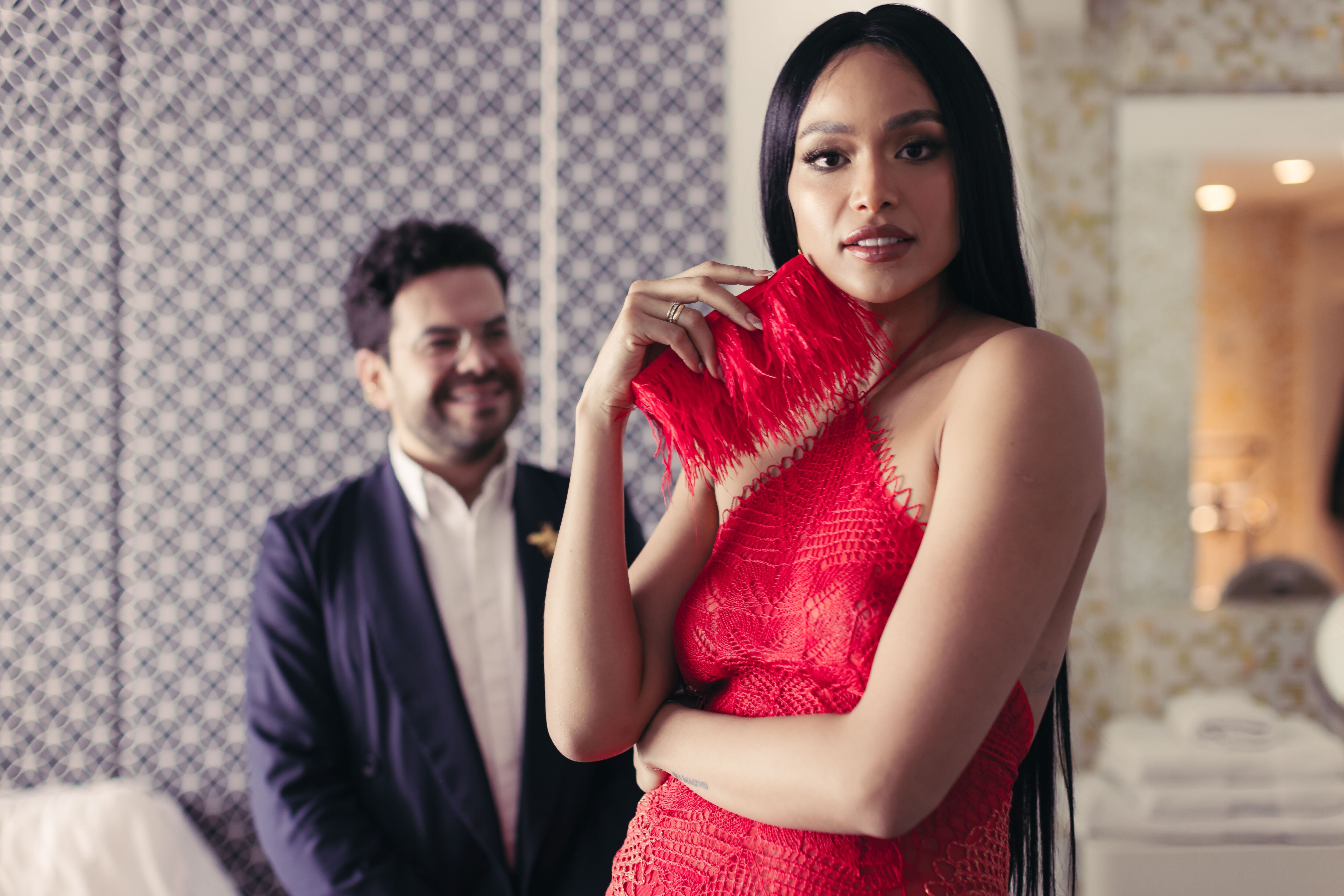 Me hicieron parte de esta campaña de expectativa que ellos hacen todos los años para lo más importante, que era la alfombra roja y para mí es un honor hacerlo. Lo que hice en esta ocasión fue traer una técnica tradicional que ya se está perdiendo en Colombia, que es de Duitama, que son las carpetas de las mamás, para decorar en la casa. Y lo había hecho con un vestido de novia y en un desfile allí. Y lo que hice esta vez fue introducir color en esta comunidad. Así, la señora Elsa Consuelo, no tejió en blanco ni en crudo, sino en rojo y asemejamos un encaje con la técnica de cinco agujas. Esta artesana ha participado en otros proyectos conmigo y con su saber creamos este vestido rojo, llamativo y transparente, lo bordamos en un tul de seda y logramos hacer esta pieza. También recreamos el look de Naomi Campbell con la ex miss Colombia, Andrea Tovar, para recrear esta magia previa a la alfombra roja, donde se prepara con maquillaje, vestido y estilismo.