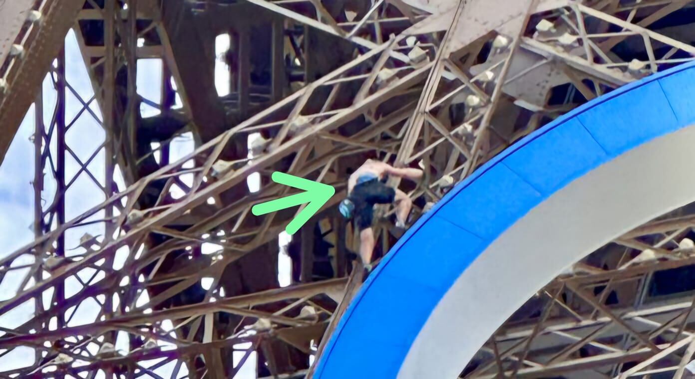 El sujeto fue avistado a 330 metros, justo sobre los anillos que adornan la Torre, por encima del primer mirador. El hombre estaba sin camisa e ignoraba la orden de la policía de bajar de inmediato.