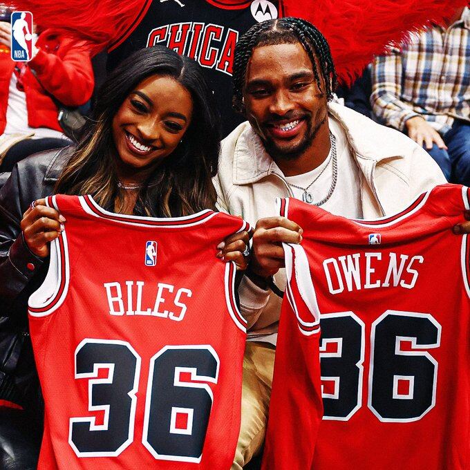 Biles, que ha ganado once medallas olímpicas a lo largo de su carrera, cuatro de ellas en París, acudió al United Center junto a su marido, el jugador de los Chicago Bears de la NFL, Jonathan Owens.