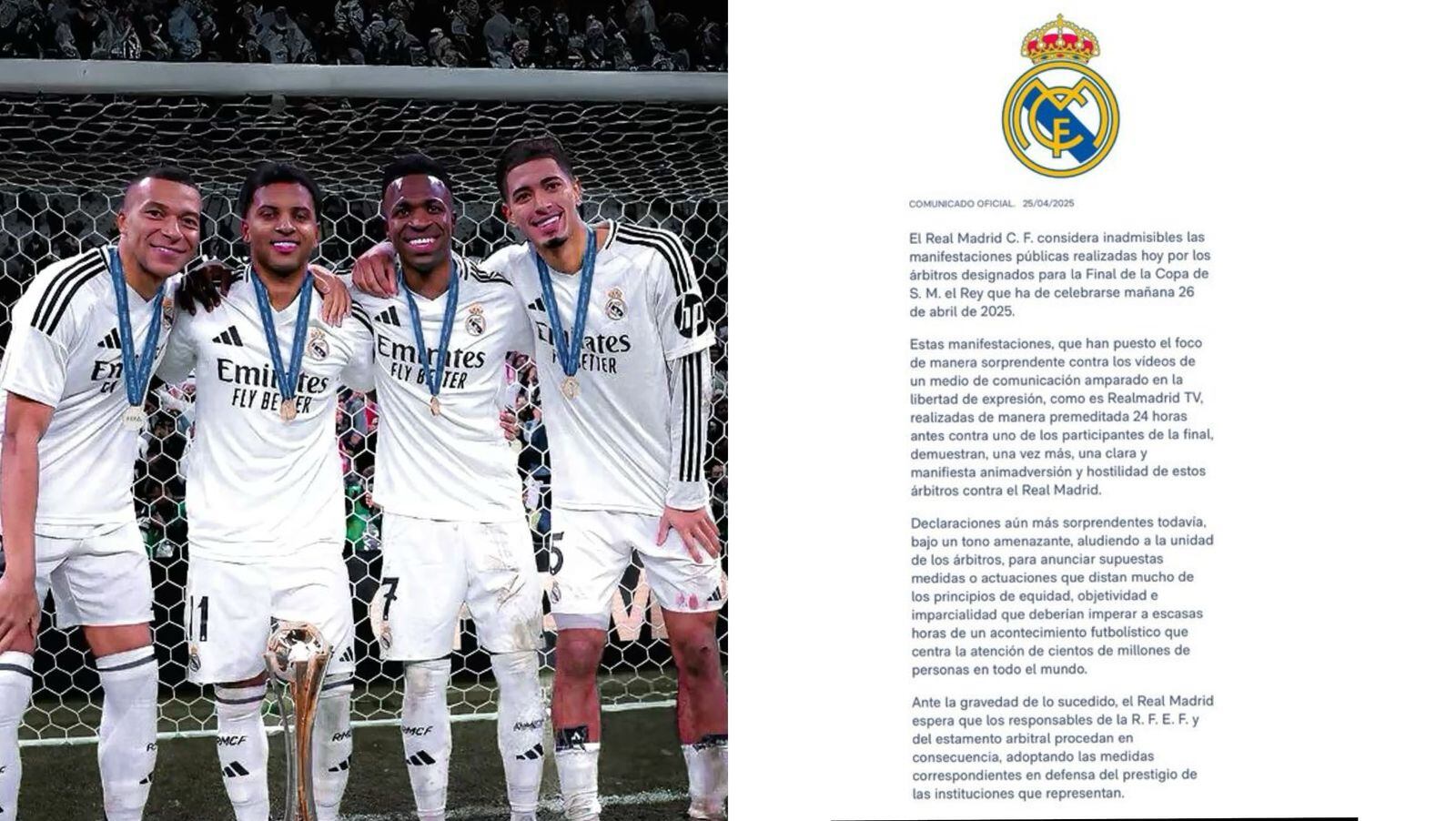 El Real Madrid emitió un comunicado oficial este jueves en el que expresa su absoluto rechazo a las declaraciones hechas por los árbitros designados para la Final de la Copa del Rey. La institución considera “inadmisibles” las manifestaciones públicas realizadas por los colegiados, que habrían vulnerado los principios de imparcialidad exigidos en una competición oficial.