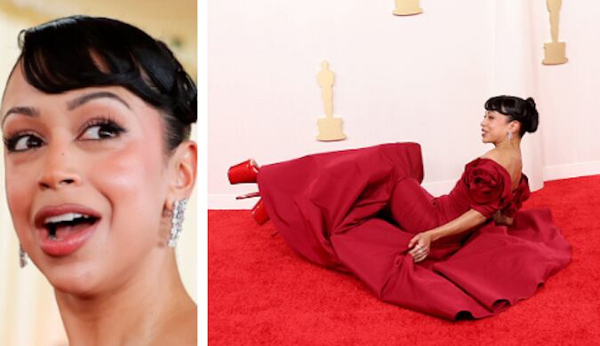La artista cayó sentada porque pudo apoyarse rápidamente sobre sus brazos, pero lo que todos destacan es que, por lo menos, cayó con gran estilo y espero en el piso elegantemente hasta que la ayudaron a levantar. Liza Koshy se tomó la situación con gracia y no dejaba de reír, mientras era auxiliada por el personal de seguridad de los Oscar. Supo asumir la compostura ante el bochornoso momento.
