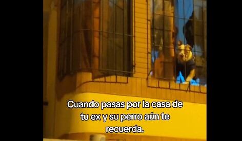 El animal sale cuando escucha el silbido del ex o la ex. En un segundo video, el ex pasa más cerca de la casa. Se ve al perro asomado por la ventana, y cómo rápidamente se quita para ladrar dentro de la vivienda, como tratando de llamar la atención de quienes están en el sitio, como si les estuviera avisando que esa persona que tanto quiere, está afuera.