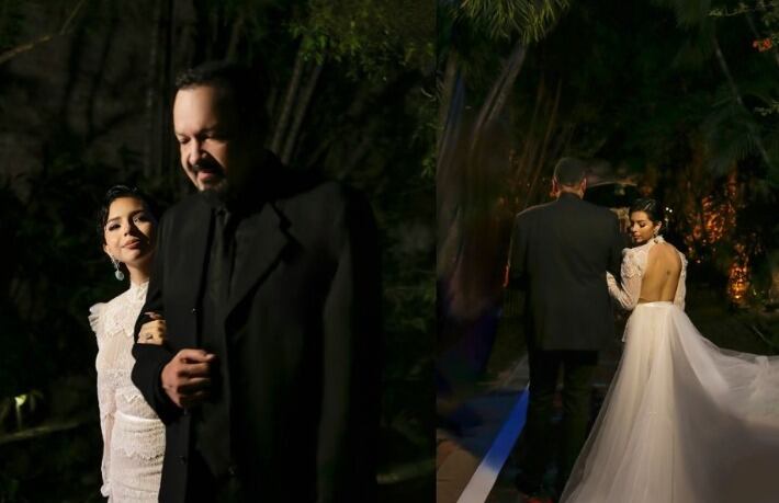 En las imágenes se pudo ver por primera vez a la hija de Pepe Aguilar con el traje de novia: un diseño presuntamente de la firma Liz Martínez Bridal, con un escote profundo en la espalda, encaje y transparencias que combinó lo tradicional con toques modernos.