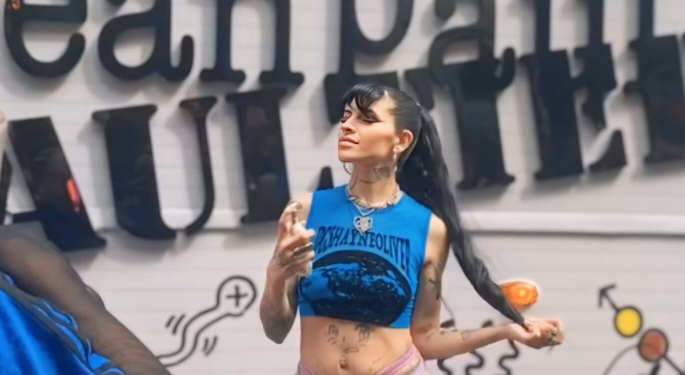 La artista de 30 años, ex pareja de Christian Nodal (con quien tiene una hija, Inti) modeló como si se encontrara en una pasarela. Ella optó por un outfit compuesto por una camiseta azul, botas industriales y una minifalda de color rosa con rellenos laterales.