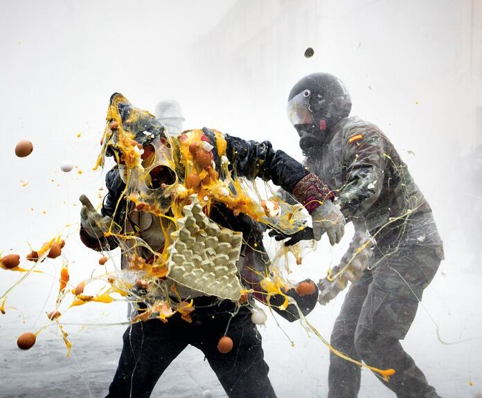 Alrededor de 625 kilos de harina, 540 docenas de huevos (6.480 unidades) y 400 docenas de cohetes han sido la «munición» usada por los participantes en esta fiesta, que tiene más de 200 años de antigüedad y en 2009 fue declarada de Interés Turístico Autonómico, ha informado a EFE el alcalde del municipio, Sergio Carrasco.