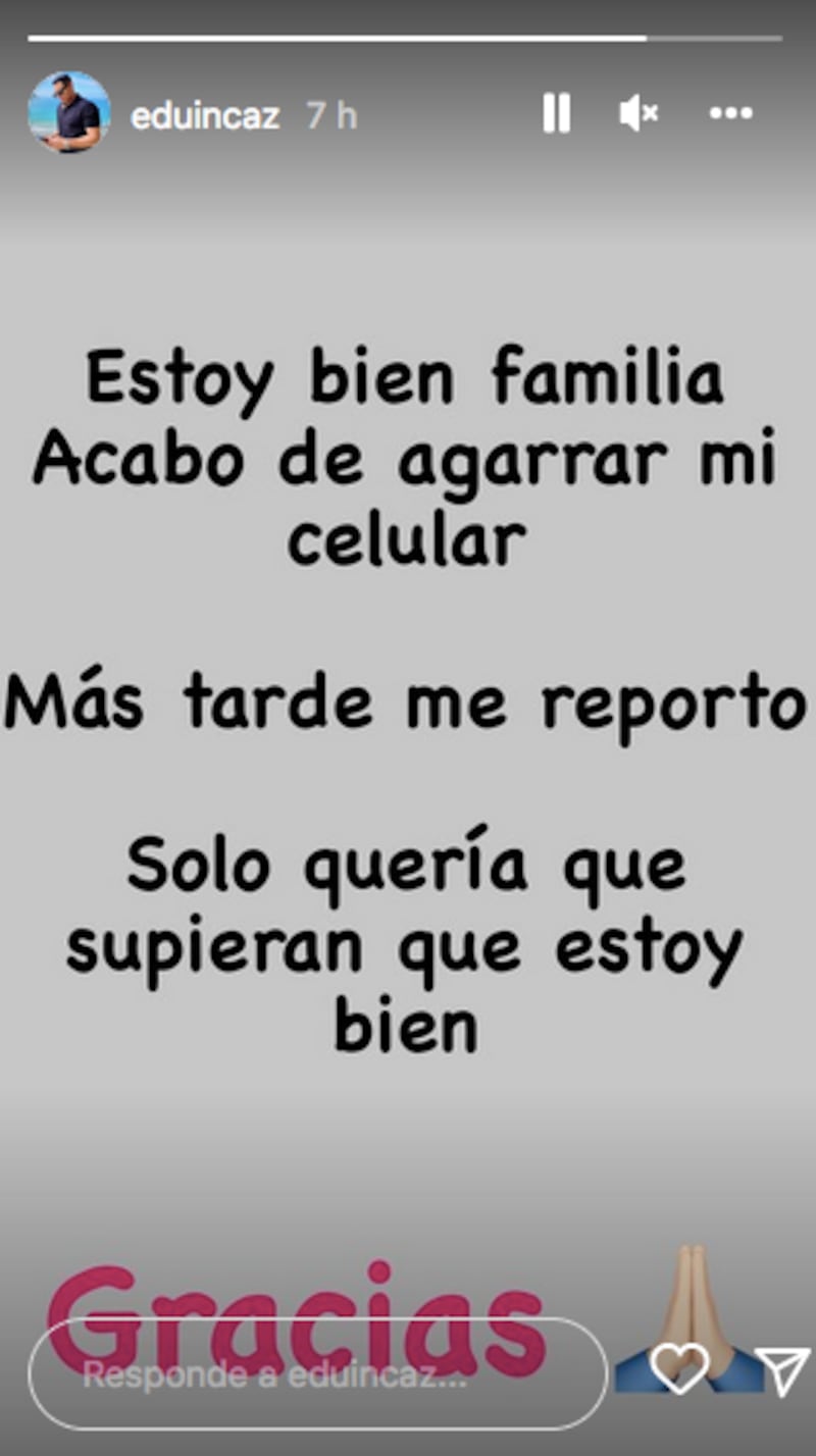 “Estoy bien familia, acabo de agarrar mi celular. Más tarde me reporto, solo quería que supieran que estoy bien. Gracias”, fue el breve mensaje que compartió el integrante de Grupo Firme, a través de sus historias de Instagram.