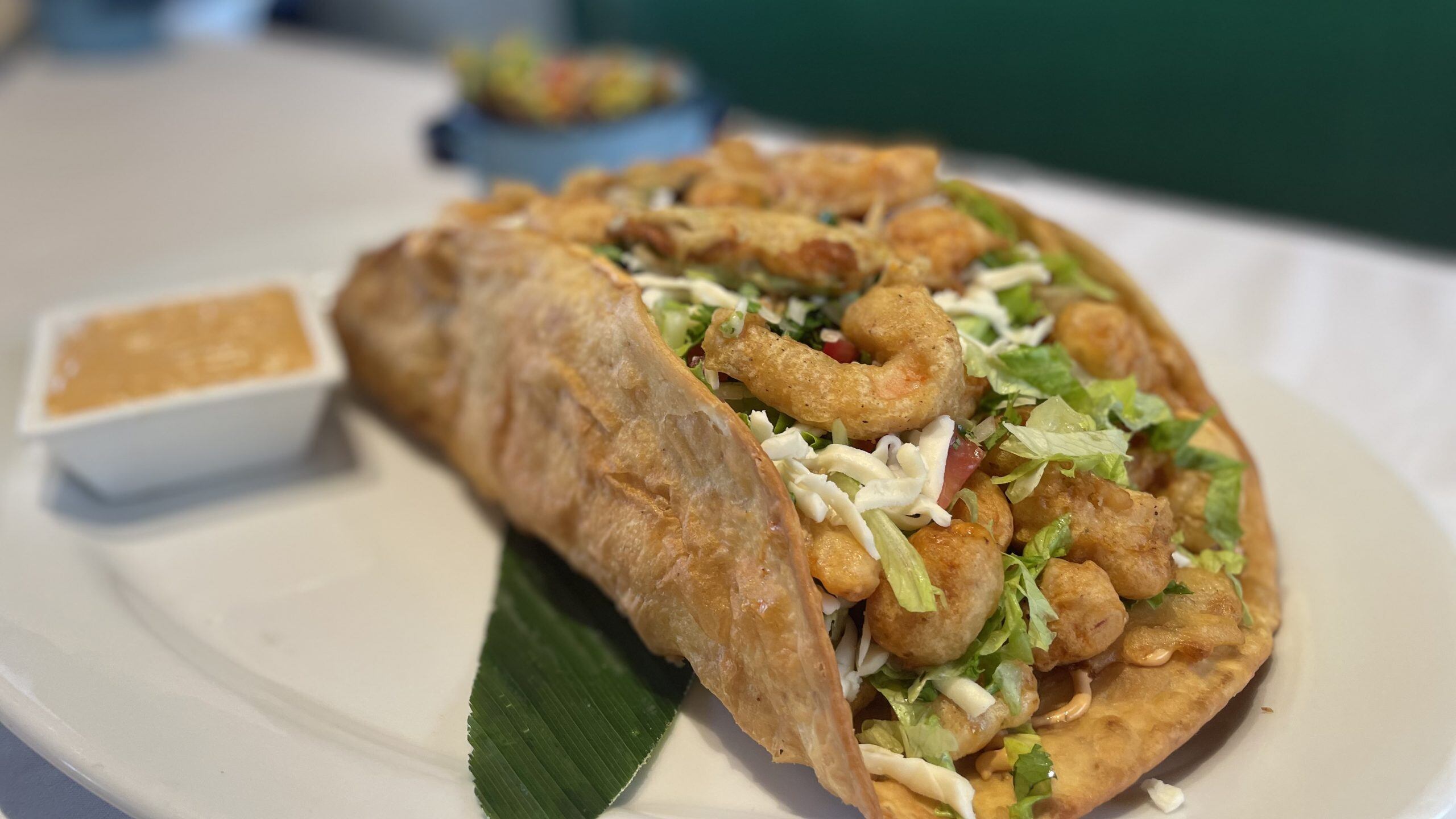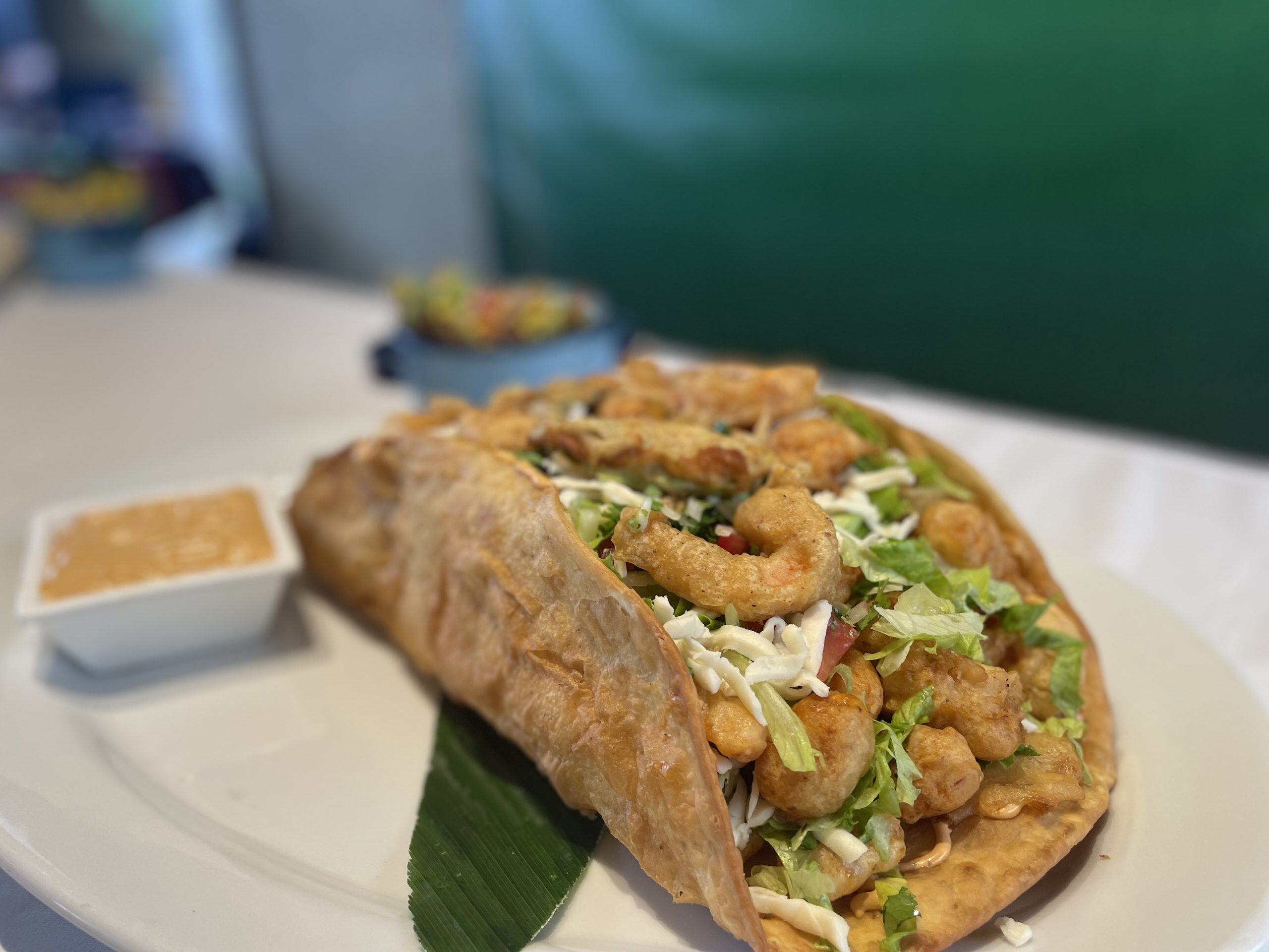 Mega chalupa elaborada de tortilla de harina, rellena de camarones capeados sobre lechuga, salsa de mayochipotle, cebolla, aguacate capeado y pico de gallo. Acompañado de papotas doradas.