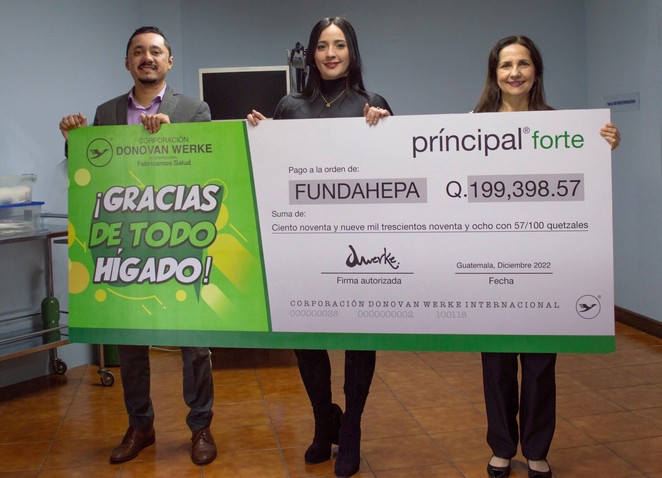 Laboratorio Donovan Werke hizo entrega del donativo en efectivo para apoyar a FUNDAHEPA para que pueda continuar con su labor de ayudar a los pacientes con problemas hepáticos. Este año se logró recaudar, por las ventas de Principal Forte del 1 al 30 de noviembre del 2022, un donativo de Q199,398.57.