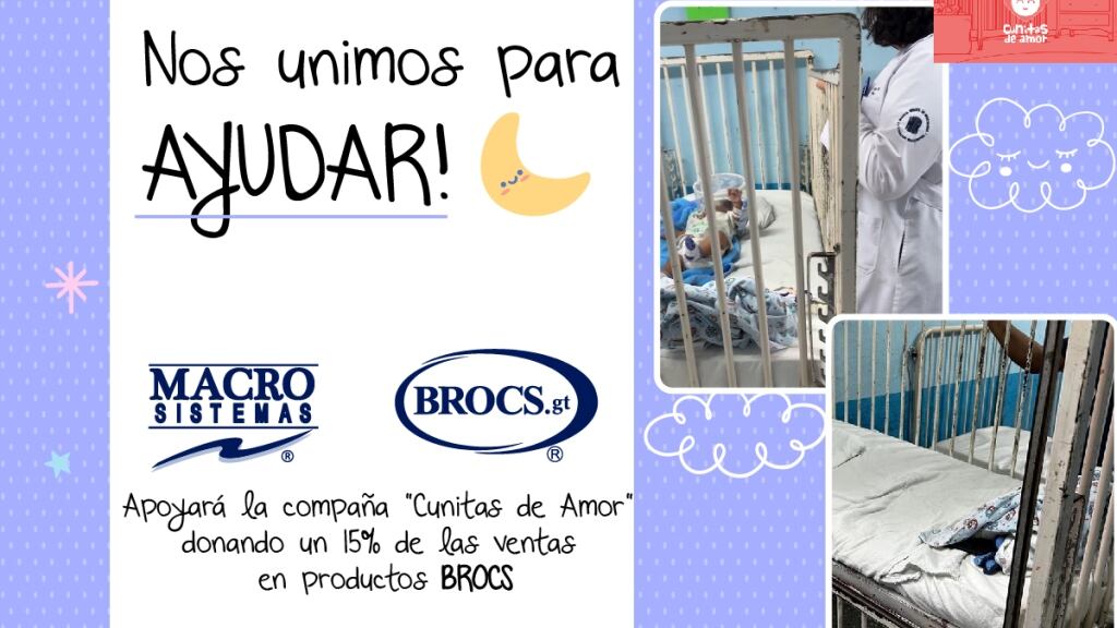 MacroSistemas, una empresa orgullosamente guatemalteca y su marca BROCS, han anunciado su participación en la campaña “Cunitas de Amor”, la cual busca brindar 77 cunas nuevas para el Hospital de Infectología y Rehabilitación Infantil, logrando así brindar a los pacientes una estancia más cómoda y segura durante su tratamiento médico.