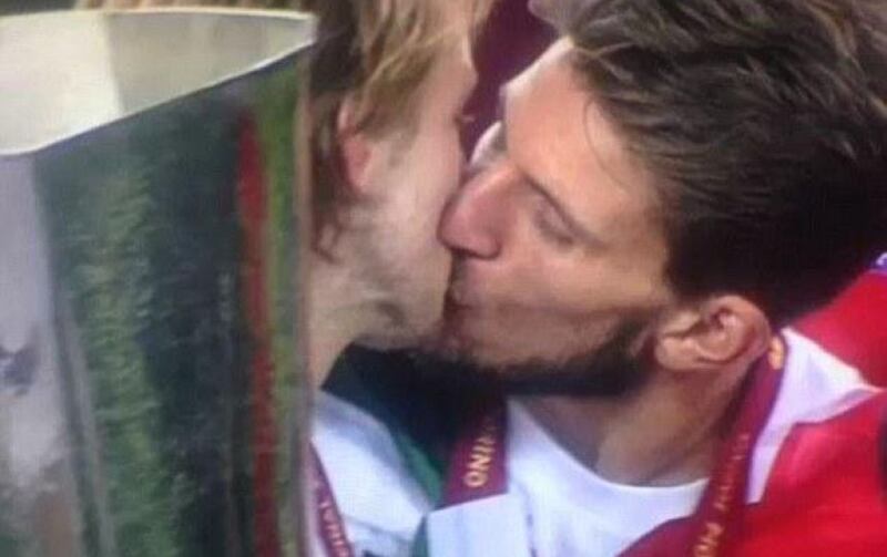 2. Ivan Rakitic y Daniel Carriço: En 2014, el Sevilla ganó la Europa League e Ivan Rakitic fue el hombre del partido. Su compañero, Daniel Carriço se acercó e intentó besarlo en el rostro, pero el beso terminó siendo en la boca. Foto: Vía twitter