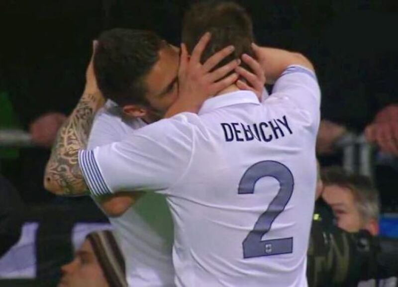 4. Olivier Giroud y Mathieu Debuchy: En 2012, Giroud marcó un gol ante Alemania en partido amistoso, gracias a un pase de Debuchy y la mejor manera de agradecérselo fue con este beso. El partido terminó 2-1 a favor de “Les Bleus”. Foto: Vía twitt