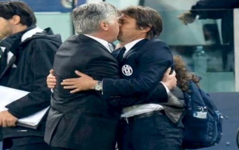 3. Carlo Ancelotti y Antonio Conte: Se encontraron en el partido de Champions League entre Real Madrid y Juventus de 2014 y aunque se dieron dos besos en la mejilla, un camarógrafo captó este momento que le dio la vuelta al mundo. Foto: YouTube