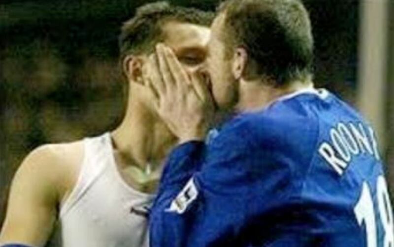11. Wayne Rooney y Tomasz Razinski: Esto ocurrió durante la época de Rooney como jugador del Everton. Los “Toffes” jugaban contra el Arsenal y perdían 1-0, pero Radzinki marcó el empate y Rooney lo “premió” dándole un beso. Foto: Vía twitt