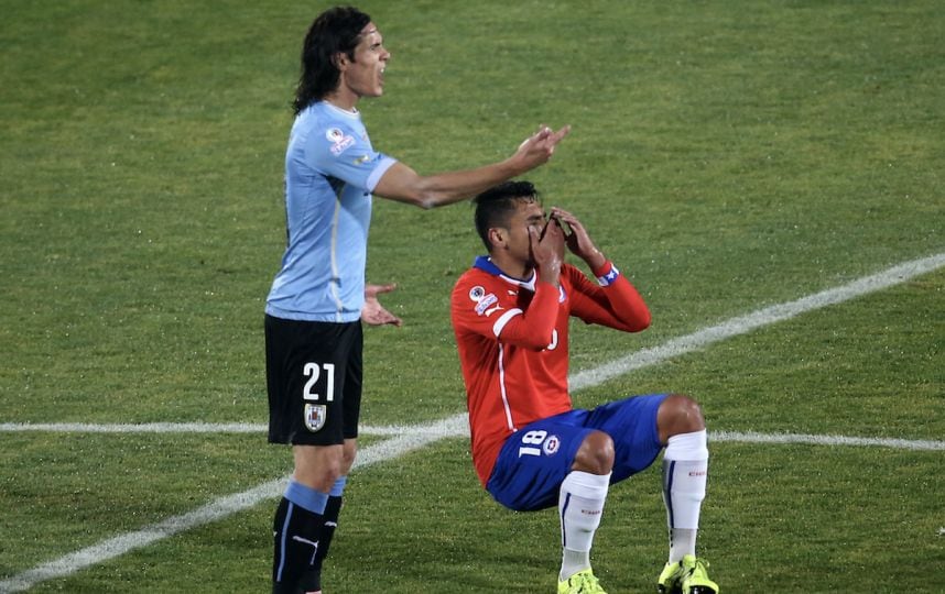 El defensa chileno tuvo este polémico gesto durante el Chile vs. Uruguay de cuartos de final de la Copa América, por lo que Cavani, molesto, respondió con una cachetada que provocó su expulsión. Foto: AFP