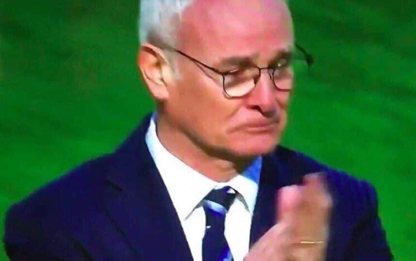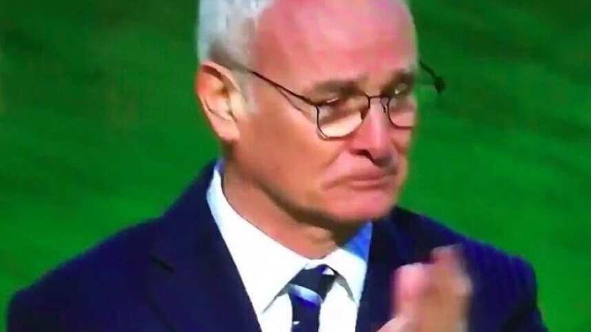 Consumada la victoria, Ranieri (quien llegó a Leicester tras un fugaz paso por la selección de Grecia) saltó al campo a felicitar a sus pupilos, pero poco pudo hacer para contener la emoción.