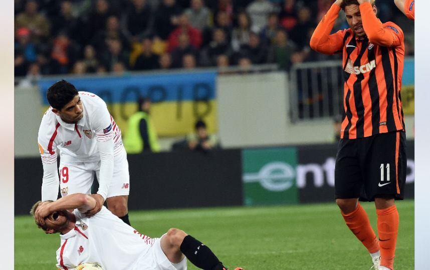 El jugador del Sevilla, Michael Krohn-Dehli sufrió una escalofriante y extraña lesión de rodilla durante el partido de semifinales de ida de la Europa League, ante el Shakhtar Donetsk.