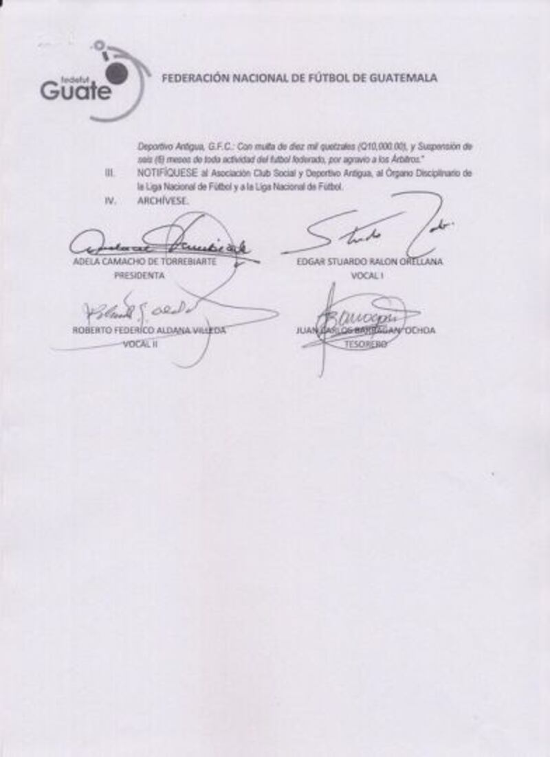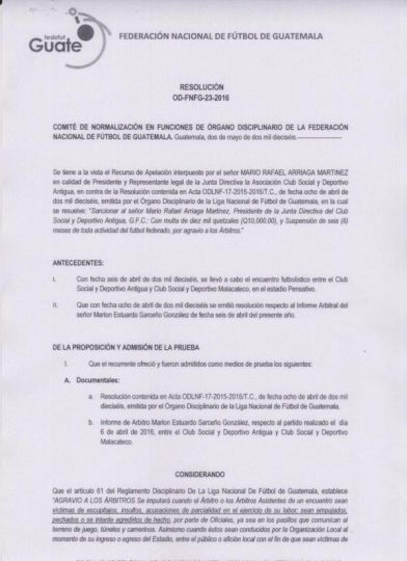 La Federación de Futbol de Guatemala (Fedefut) ha dado a conocer que revoca la sanción impuesta por ellos mismos al presidente y representante legal de la junta directiva del club Antigua GFC, Mario Rafael Arriaga Martínez.