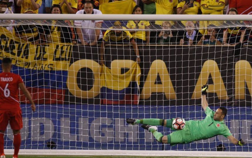 El guardameta colombiano David Ospina atajó el cobro de Miguel Trauco y Christian Cueva lo lanzó por encima del arco.
