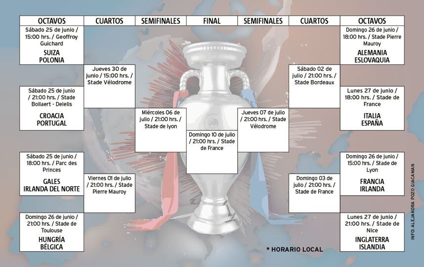 En el otro lado, el llamado “cuadro de la muerte” donde se enfrentarán Italia con España, está Alemaniacon Eslovaquia, Francia frente a Irlanda, e Inglaterra Islandia.