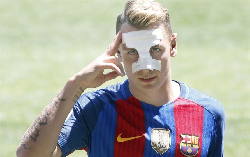Digne asistió a su presentación con un gran vendaje en el rostro y explicó a Barça TV, que sufrió dos fracturas, una el año pasado y otra esta temporada, por lo que necesitó pasar por el quirófano.