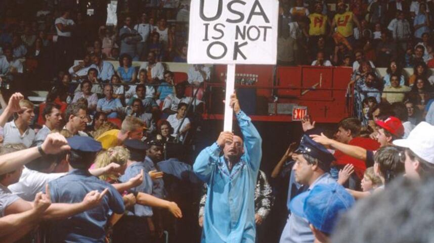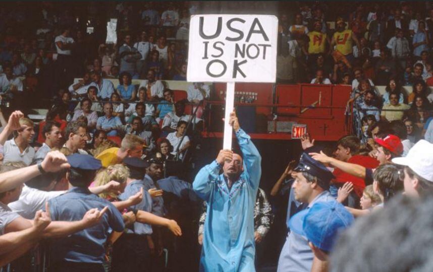 Además, el universo del entretenimiento deportivo lo recuerda por la pancarta con la leyenda: “USA is not OK. Con este objeto se encargaba de molestar a luchadores y aficionados.