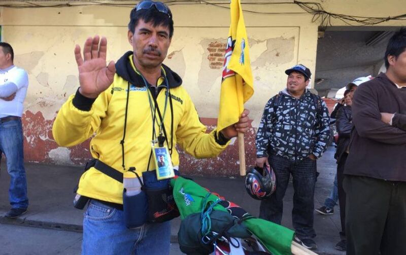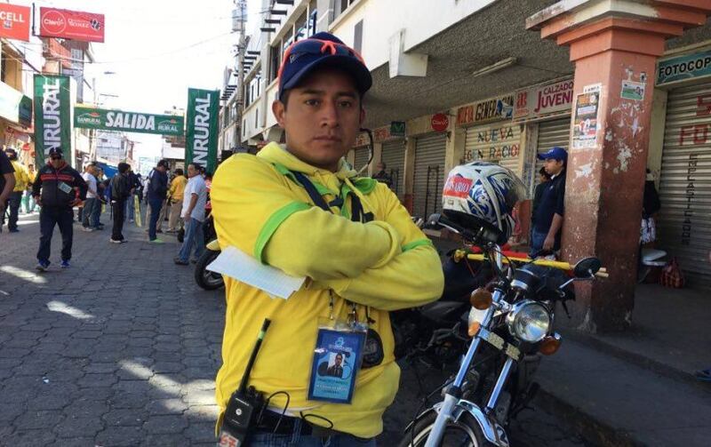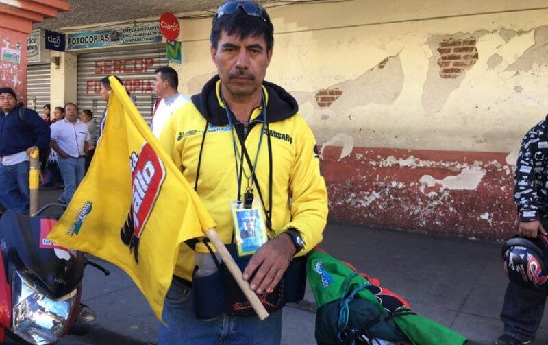 En la caravana los comisarios se caracterizan por llevar chumpas de color amarillo con motivos negros, y según su tarea, llevan banderas, cronómetros o silbatos. Francisco Méndez está por primera vez en la Vuelta a Guatemala y explica la importancia de la comunicación por radio.