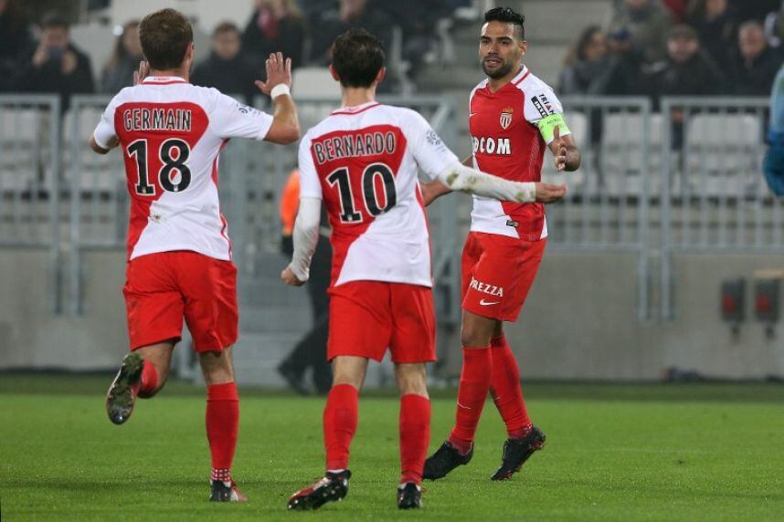 Radamel Falcao logró un triplete y Mónaco continuó con su paso avasallador al vencer el sábado 4-0 a Burdeos para apoderarse del liderato en la liga francesa.