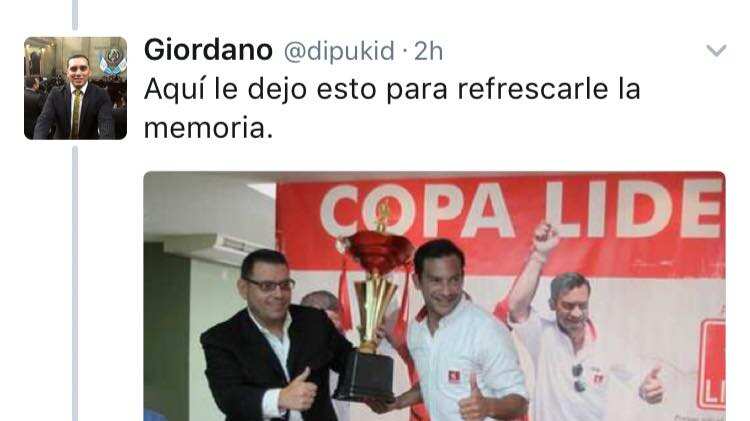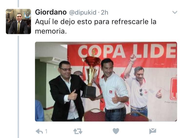 "Ahora yo soy el frustrado, no serás vos diputado tránsfuga que te has prostituido de partido en partido para seguir sangrando a mi país", a lo que la cuenta contestó: "Pero bien que andabas con Baldizón, no jadas hermano aquí el político frustrado sos vos".