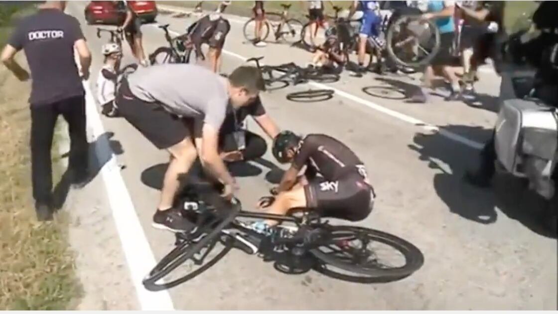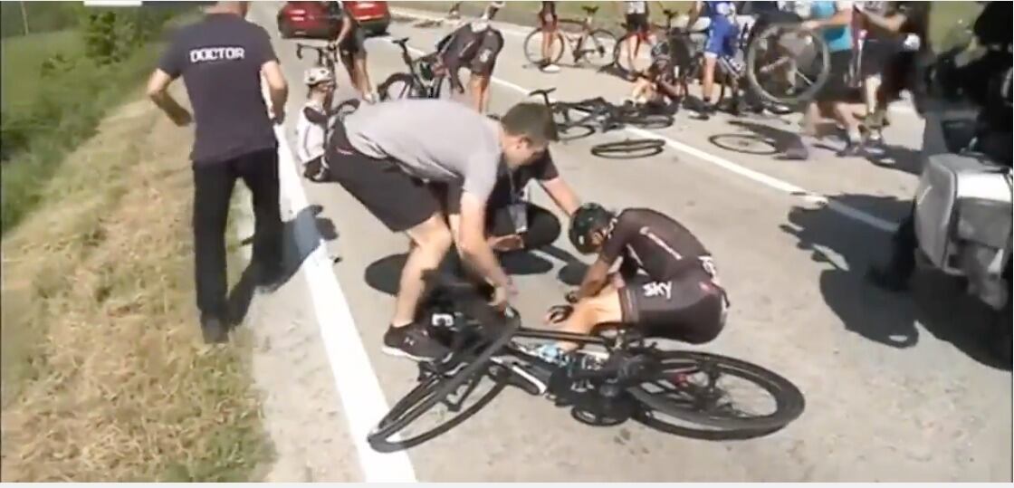 Se trata del español Mike Landa del equipo Sky, quien fue afectado por un motociclista que causó una caída masiva, pero aún con varios golpes, ha dicho que está de pie.
