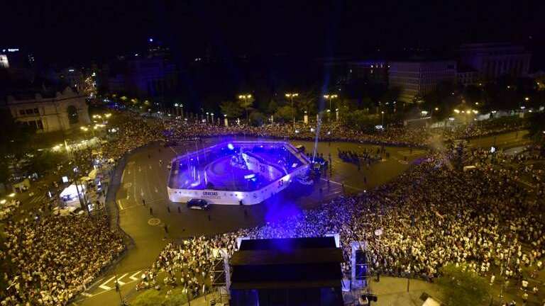 Los hinchas, muchos de ellos con bufandas blancas y camisetas del equipo merengue, botaban y mostraban su alegría en medio de la música que ponía un pincha-disco desde un escenario, situado cerca de la fachada del ayuntamiento madrileño.